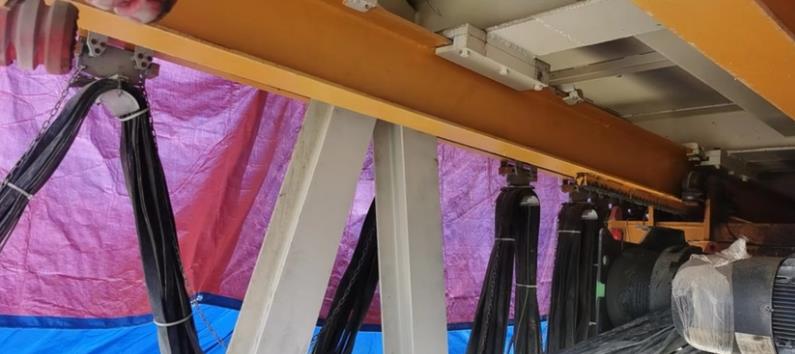 4、調(diào)整牽引鋼絲繩,工字鋼滑車使其長度小于同節(jié)電纜長度,運行時由牽引鋼絲繩受力�