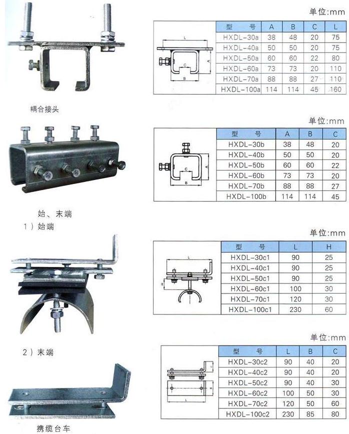 HXDL系列移動電纜滑線有軌�、電纜小�、電纜以及懸吊、固定等組件組合而成。該�(chǎn)品以其簡潔的�(jié)�(gòu)、完備的性能被廣泛地�(yīng)用于鐵路貨場、港口碼頭等起重運輸機械的移動供電和信號傳輸系統(tǒng)�� 型號�(guī)� 軌道截面尺寸(mm) 適配小車型號 A B C D HXDL-33 33 40 14 2.0 DTC-33 HXDL-40 40 40 14 2.0 DTC-44 HXDL-50 50 50 16 2.5 DTC-50 HXDL-60 63 18 18 4.0 DTC-60 HXDL-70 72 68 22 4.0 DTC-70 HXDL-100 100 100 35 6.0 DTC-100 注:1、軌道標準長度:4m�6m�2、軌道材料:冷軋鋼板、不銹鋼�