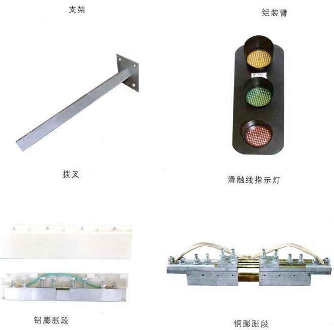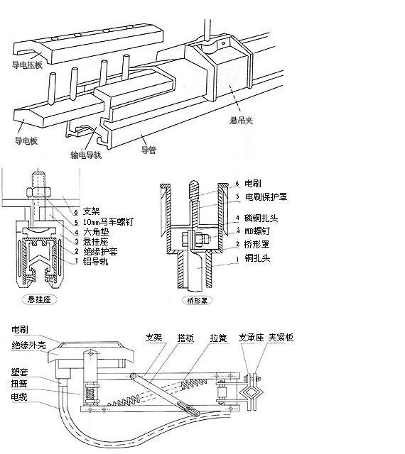 單極組合式滑觸線導電器:為接簧支撐式,僅在滑觸線下部即可推入,但須在牽引器同步進行,并保證拉簧力量適當,以免加大電刷磨�。牽引器與導電器同步進行,可用螺栓或電焊方式固定在行車等移動電器上,并適當保證導電器運行不受扭力�
