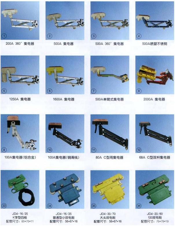 集電器是滑觸線系�(tǒng)中集電側(cè)拾取電能的主要裝置之一,它通過集電刷與�(dǎo)軌的滑動(dòng)接觸,將電能直接傳�(dǎo)至用電器,從而實(shí)�(xiàn)系統(tǒng)的移�(dòng)供電.集電器由�(jī)械結(jié)�(gòu)的張力裝置和直接與導(dǎo)軌滑�(dòng)接觸的集電刷兩部分組�,�(jī)械結(jié)�(gòu)的張力裝置決定集電刷與導(dǎo)軌的滑動(dòng)接觸壓力和機(jī)�(gòu)的穩(wěn)定�,集電刷則是導(dǎo)軌滑�(dòng)接觸拾取電能的導(dǎo)�,它的性能和導(dǎo)電質(zhì)量以及材料結(jié)�(gòu)成分的優(yōu)�,將直接影響整�(gè)系統(tǒng)�(shè)備的安全�(yùn)行質(zhì)�,因此集電器是整�(gè)滑線系統(tǒng)中最主要的部件之一.