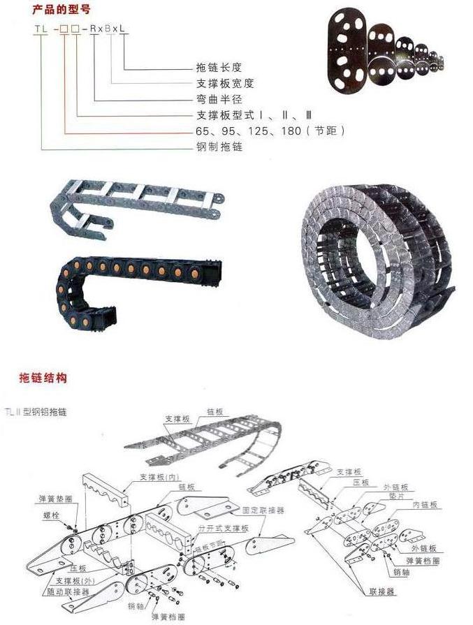 TL系列鋼制電纜拖鏈,銷軸及支撐板和隨動連接器等零件組成。拖鏈可適用最大移動速度�40�/�,拖鏈安全使用壽命不少于100萬次(往�(fù)�。該�(chǎn)品具有設(shè)�(jì)精巧、使用靈活等特點(diǎn),被廣泛�(yīng)用與冶金、鋼鐵、鑄�、大型機(jī)械等行業(yè)作為短距離,�、氣、水軟管和電纜同時移動之��